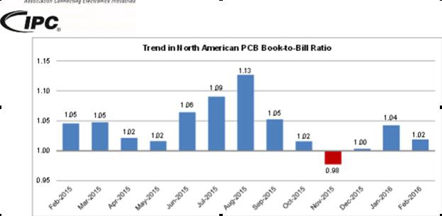 2016年3月31日,IPC發布《2016年2月份北美地區PCB行業調研統計報告》。報告顯示,2月份PCB銷量反彈,強于訂單量,訂單出貨比由此回落至1.02。 2016年2月份北美PCB總出貨量,與20