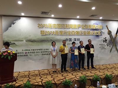 2015年7月27日,由中印制電路行業(yè)協(xié)會(huì)主辦的“2015年中印制電路產(chǎn)業(yè)發(fā)展研討會(huì)”在深圳明華際會(huì)議中心隆重召開(kāi),會(huì)議期間頒發(fā)了2014年度中印制電路行業(yè)百?gòu)?qiáng)企業(yè)證書(shū)。