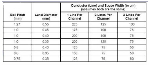 一旦完成了Dog bone型扇出,并且確定了特定的過孔焊盤尺寸,二步就是定義從BGA進入電路板內層的走線寬度。確認走線寬度時要考慮許多因素。表1顯示了走線寬度。走線之間要求的小空間限定了BGA迂回布線空間。重要的是要知道,減小走線之間的空間將增加電路板制造成本。