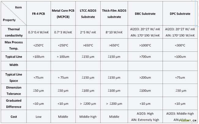 目前市場上廣泛使用的電路板類型如下表一所示,其中陶瓷基板其高導(dǎo)熱系數(shù)、高線路解析度、低累進(jìn)公差、及允許打線工藝與直接共晶工藝等特性皆優(yōu)于FR-4 PCB與MCPCB。但是,陶瓷基板并非皆具有相同的特性,因工藝與材料的差異,陶瓷基板因而可分類為:低溫共燒陶瓷(LTCC, Low-Temperature Co-fire Ceramics)基板、厚膜(Thick-Film)陶瓷基板、DBC (Direct Bonding Copper)陶瓷基板與DPC (Direct Plating Copper)陶瓷基板,其中DPC陶瓷基板又可稱為薄膜(Thin-Film)陶瓷基板。