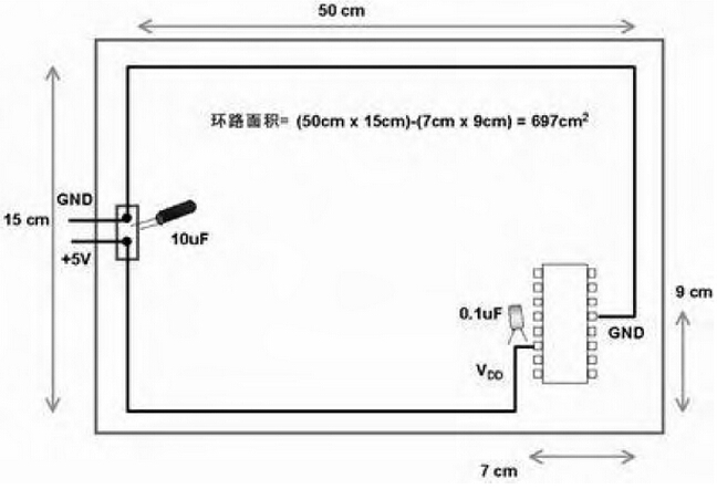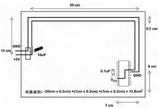 上圖通過(guò)改進(jìn)——電源與地線靠近走線,減小了回路面積,降低了電磁干擾(679/12.8,約54倍)。因此,電源與地盡量應(yīng)該靠近走線!而信號(hào)線之間則應(yīng)該盡量避免并行走線,降低信號(hào)之間的互感效應(yīng)。