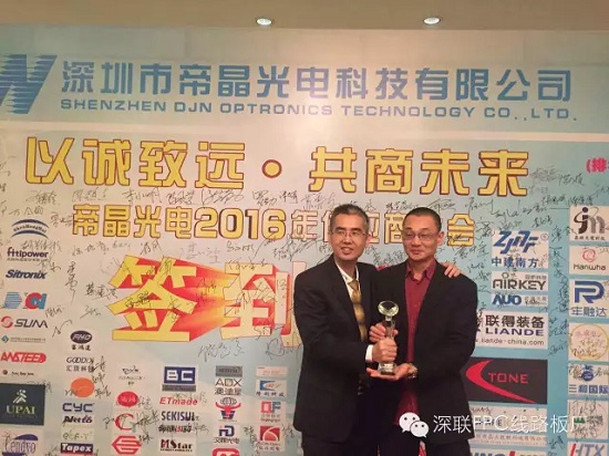 會(huì)上,帝晶光電陳總、蘇總為供應(yīng)商們頒獎(jiǎng),深聯(lián)電路文總(下圖右起四個(gè))上臺(tái)領(lǐng)獎(jiǎng)!