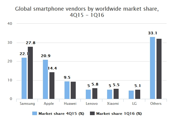 TrendForce公司稱,蘋果在全球手機(jī)市場(chǎng)上所占的份額從2015年四季度的20.9%下跌到了2016年一季度的14.4%;而它的競(jìng)爭(zhēng)對(duì)手三星,得益于其Galaxy S7和Galaxy S7 Edge手機(jī)的強(qiáng)勁銷售態(tài)勢(shì),其市場(chǎng)份額從22.1%增長(zhǎng)到了27.8%。