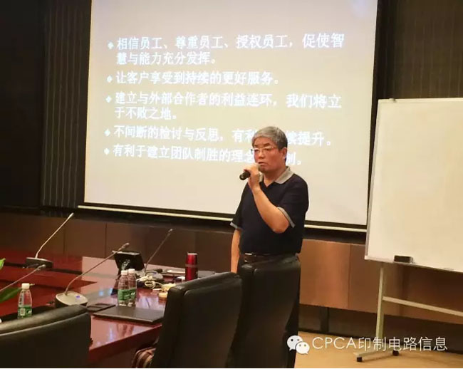 20日上午,資深專家閆海忠先生首先開講。閆海忠先生,研究員級高級工程師。曾任南方航空動力機械公司工藝員、工程師、技術(shù)室主任、分廠廠長,原深圳中航集團下屬深南電路股份有限公司總經(jīng)理,現(xiàn)CPCA顧問。2005年~2012年在深圳中航集團分管《管理創(chuàng)新和精益六西格瑪管理推廣》工作,具有廣泛的企業(yè)管理和精益生產(chǎn)管理經(jīng)驗。深南電路歷年來持續(xù)推進管理創(chuàng)新工作,各種管理方法工具諸如TQC、6S、六西格瑪、精益生產(chǎn)、項目管理等得到了深入、全面的應(yīng)用,管理創(chuàng)新活動和實踐敢為人先,取得了良好的成效,為先進管理理念和方法的推廣起到了積極的垂范作用!本次專題培訓(xùn)主要由閆海忠專家傳授精益生產(chǎn)的課程,內(nèi)容包括:精益管理理念、精益生產(chǎn)管理的實質(zhì)追求、精益生產(chǎn)管理的路徑和方法。閆老師特別指出,精益生產(chǎn)不是一項孤立的管理工作。