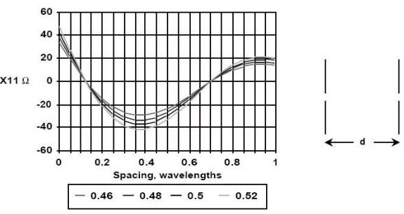 雙極是雙極數(shù)組的基本元素,一個圓柱狀雙極(cylindrical dipole)是大約在 l = 0。95(λ/2) 處共振。一個雙極近共振的饋點電抗,大約與縮短過的四分之一波長的Z0 =1000奧姆之電線相同。等效傳輸?shù)淖杩故翘炀€大小的函數(shù),如下圖所示: