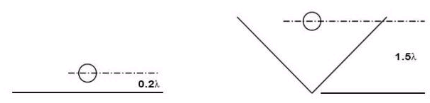 可將一個電流天線(例如:一個雙極天線)放在一個導(dǎo)電平面前,來產(chǎn)生一個定向天線。 當間距為 0.1-0.3λ 時,一個 λ/2 雙極天線的增益大約是 6 dB(這是 6 dBd的意思,也就是 8 dBi ,因為一個雙極天線的增益是 2 dBi)。