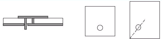 另一種饋線匹配法是將一同軸線的中心導(dǎo)體透過介電質(zhì),在適當?shù)淖杩裹c接觸到補片的底部。補片的中心是經(jīng)過此結(jié)構(gòu)中的一個過孔(via)接地的,如下方的左圖與中圖所示。
