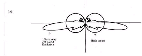 共線性雙極數(shù)組(collinear dipole array)廣泛地應(yīng)用在單點對多點通訊上,雙極的數(shù)組沿著垂直軸排列,提供集中于水平軸的場型,同時覆蓋360°的區(qū)域時。下圖表示半波雙極數(shù)組在不同相角饋給,所產(chǎn)生的輻射場型。