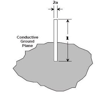 雙極的一半,一個四分之一波長單極天線具有輻射電阻R = 36奧姆,可在「半無限導(dǎo)電接地面(semi-infinite conducting ground plane)」上運作,如下圖所示。