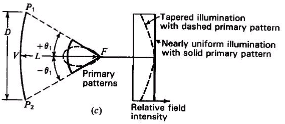 上圖顯示了在設(shè)計拋物面天線時,所需面對的取舍問題:弧面對應(yīng)的夾角和饋線的指向性。如果給定一個直徑與焦距長度,對弧面直徑D所對應(yīng)的夾角而言,此饋線場型太寬了,將造成能量大量溢出,導(dǎo)致增益減少且天線溫度增高。反之,如果所對應(yīng)的夾角大于饋線的「半功率波束寬度(Half Power Beam Width;HPBW)」,將會導(dǎo)致照射度不一致,且在邊緣部位會逐漸減弱,并伴隨著輻射效益與增益的損失。