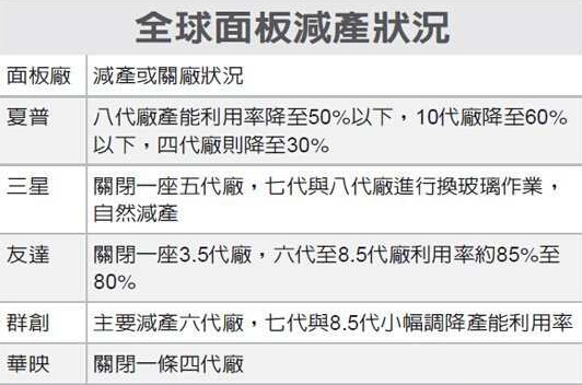 友達(dá)方面,已關(guān)閉一條3.5代廠,目前六代至8.5代的產(chǎn)能利用率同步下調(diào)。謝勤益預(yù)估,友達(dá)的產(chǎn)能利用率已降至85%至80%之間。